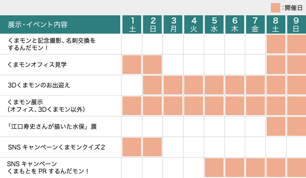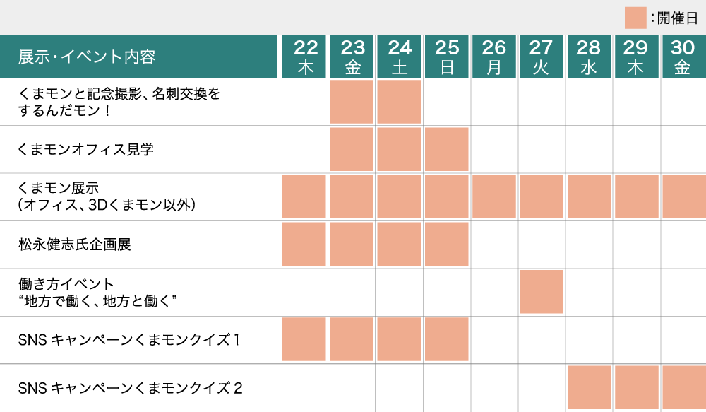 - イベント全期間で展示が可能ですが、くまモンオフィスの見学は休日、祝日のみとなっておりますのでご注意ください。